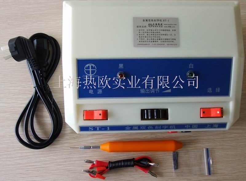 金屬雙色刻字機ST-1,重慶金屬電火花打標機,金屬電火花刻字機,電火花打碼機,雙色金屬刻字碼機。利用電火花原理在金屬表面刻出發黑或發白標識。金屬雙色刻字機雖然刻字效果不如電動刻字標記筆H-13 那樣美觀,但它能夠對高硬度的材質進行輕松刻印,而且不影響工件平整度。- 產品描述